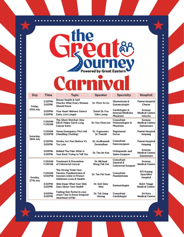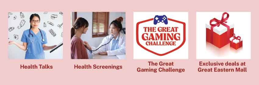 Join us at The Great Journey Carnival, happening from 25 to 27 July 2025 at Great Eastern Mall Concourse. Embark on a journey towards better health! Discover insightful health talks, complimentary health screenings, exclusive offers, fun-filled games and activities.