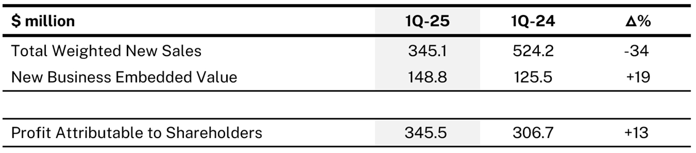 The Group’s TWNS for 1Q-25 declined by 34% against the same period last year mainly due to lower single premium sales following the shift towards regular premium sales.