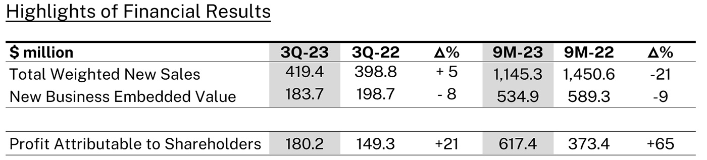 The Group’s TWNS for 3Q-23 increased by 5% against the same period a year ago, buoyed by sales from Singapore due to new product launches. The Group’s TWNS for 9M-23 declined 21% compared to same period last year due to lower single premium sales. Correspondingly, the Group’s NBEV fell 9% for the 9M-23 due to the lower sales.