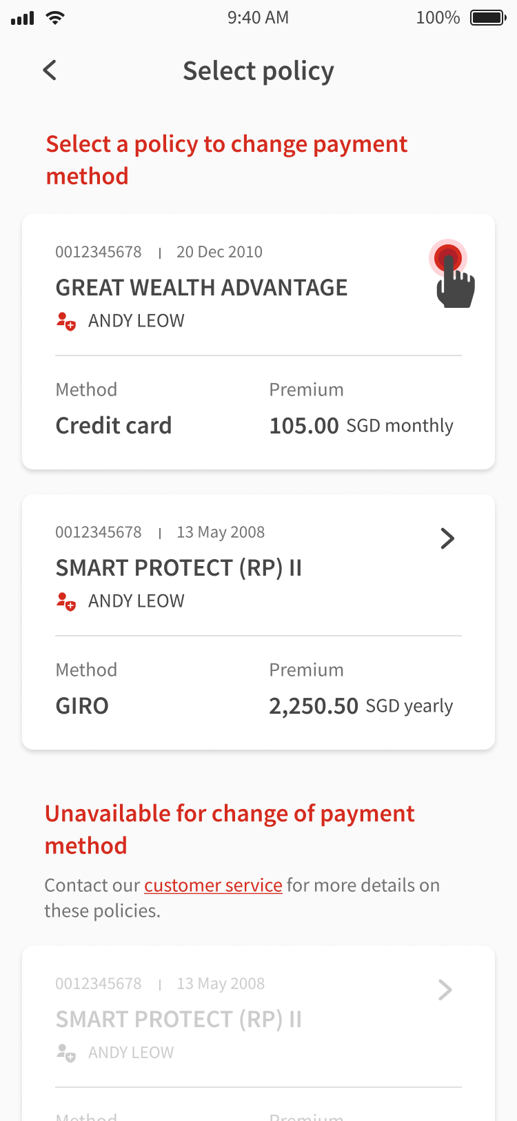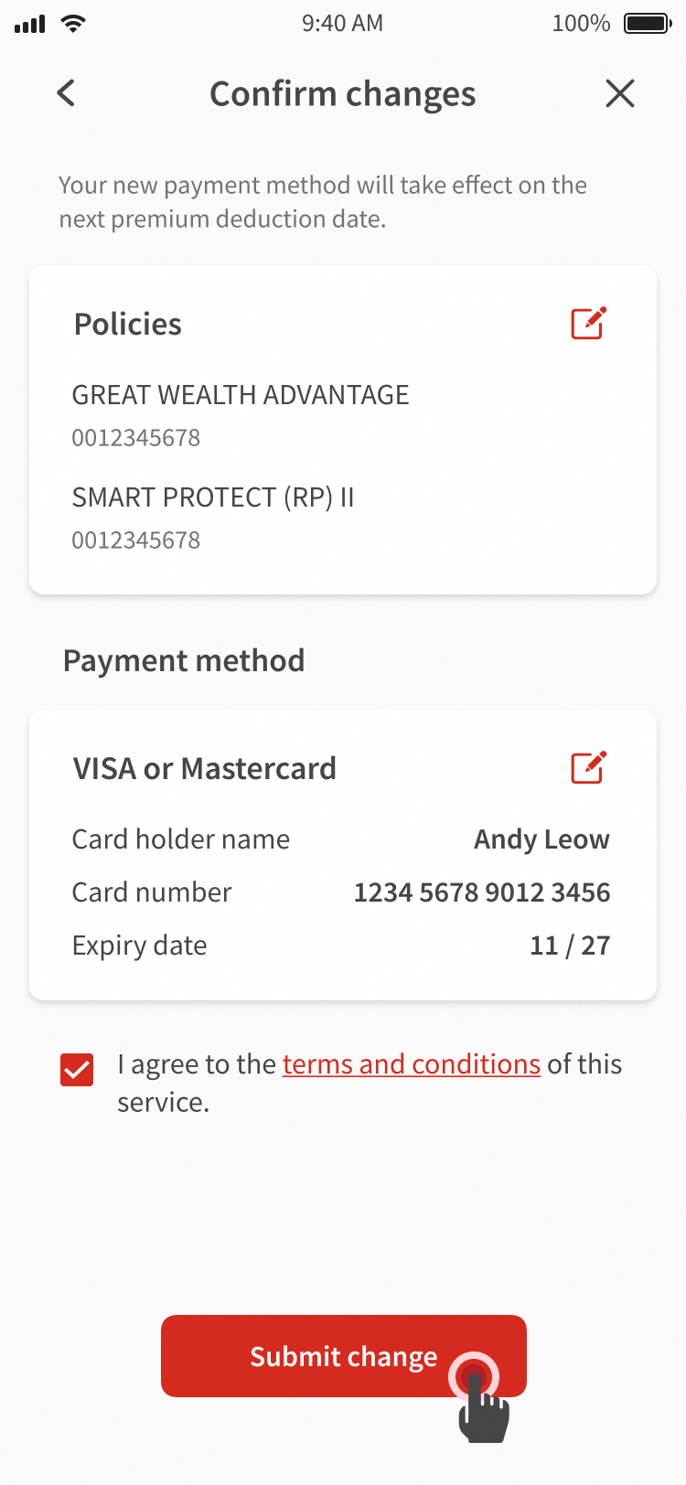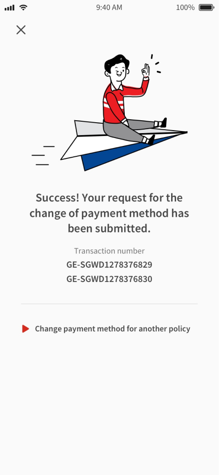The effective date for your change may not be immediate. You can refer to the effective date in the request notification in the Great Eastern App. In the meantime, please continue to pay your premium on the stated due date.