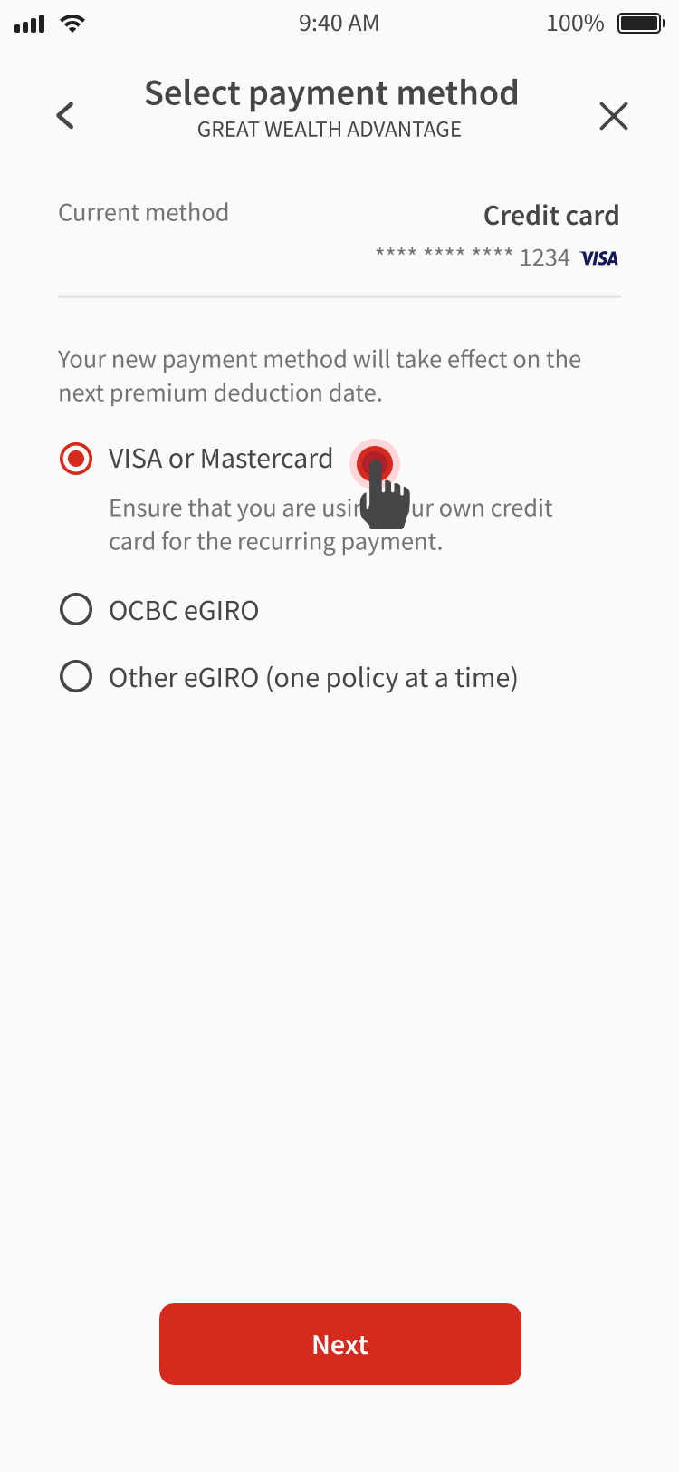 If you are unable to change the payment method for your policy via the Great Eastern App, you may proceed with a manual submission. Please continue to make premium payments as per the existing method until the new payment method is approved.