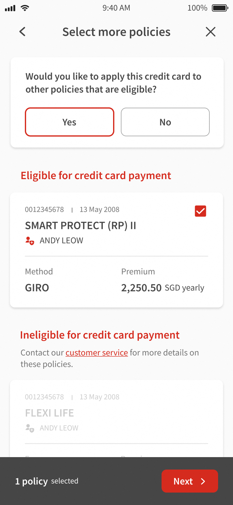 Credit card payment is not supported for policies purchased before 1 July 2014, and only the OCBC Great Eastern Cashflo card is supported for policies purchased before 15 October 2020.