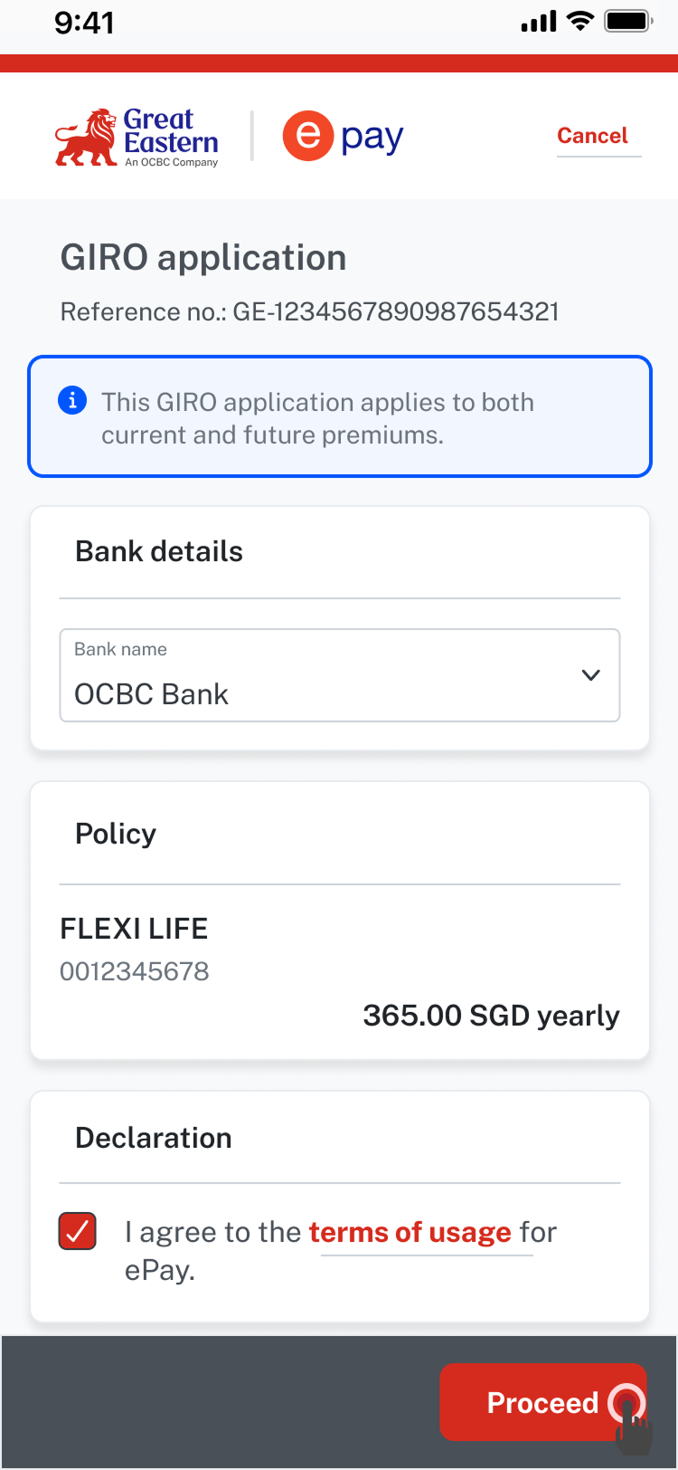Alternatively, enroll for scheduled payments such as eGIRO for added peace of mind. We will deduct the premium automatically for renewals.