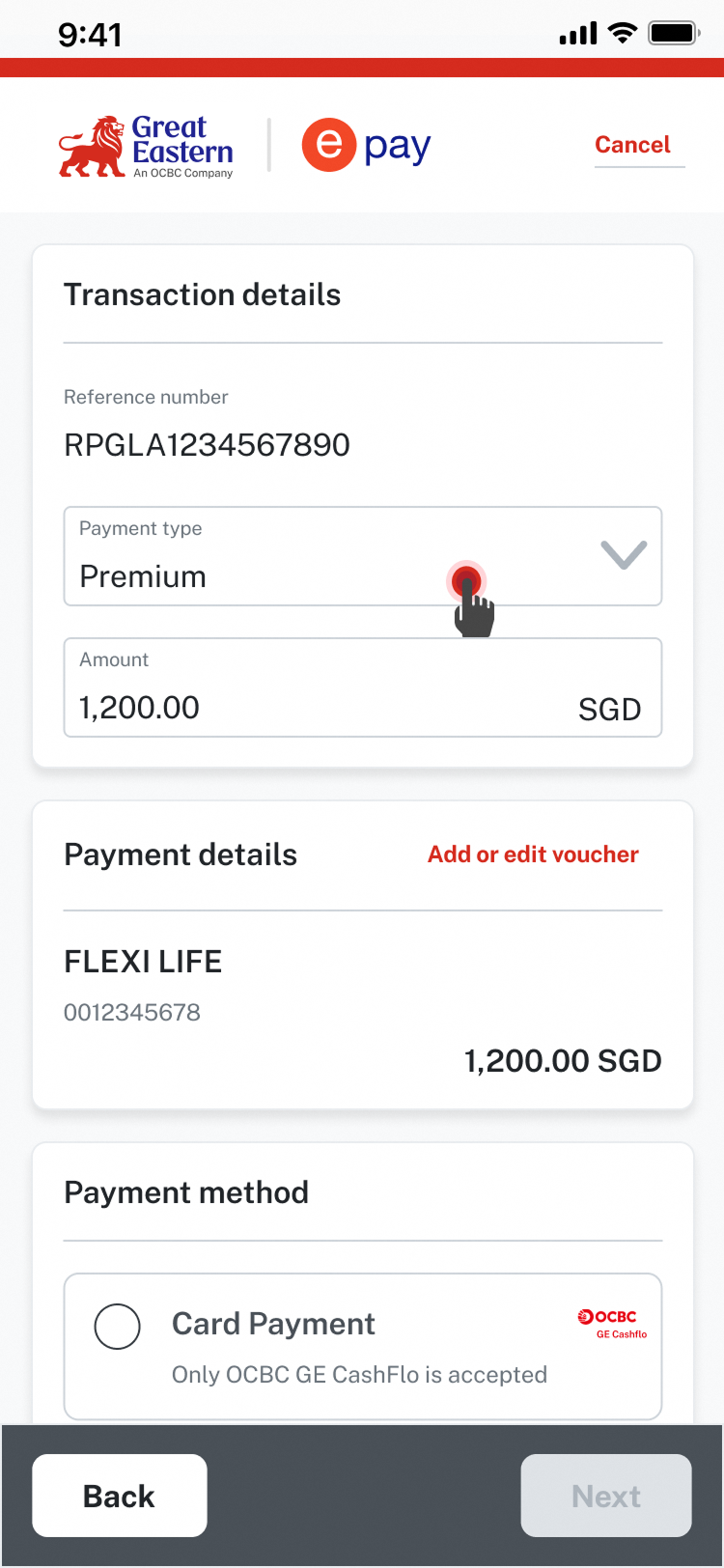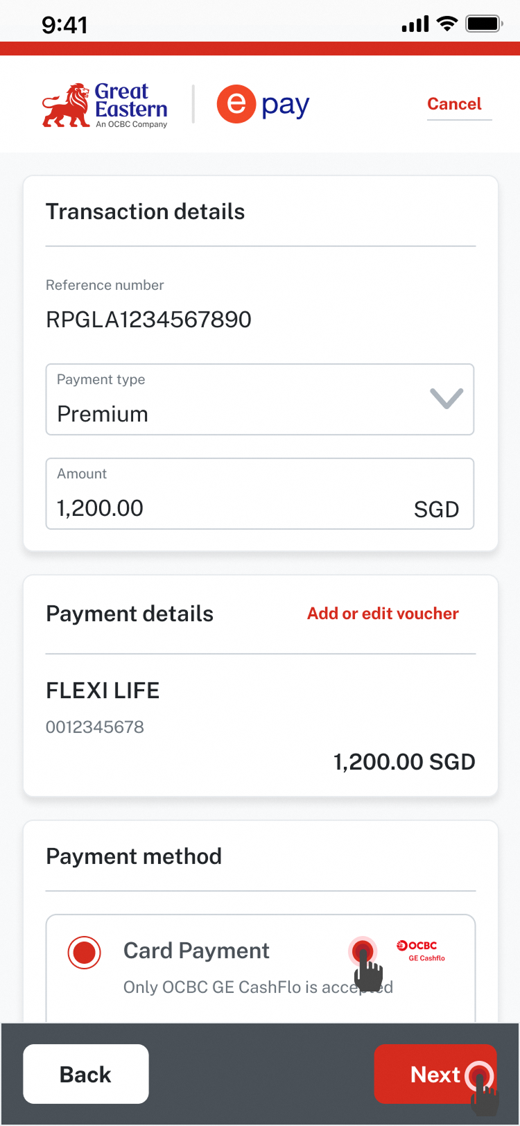 - For life policies launched from July 2014 and inforce by 14 October 2020, only the OCBC-Great Eastern Cashflo card can be used for payment.