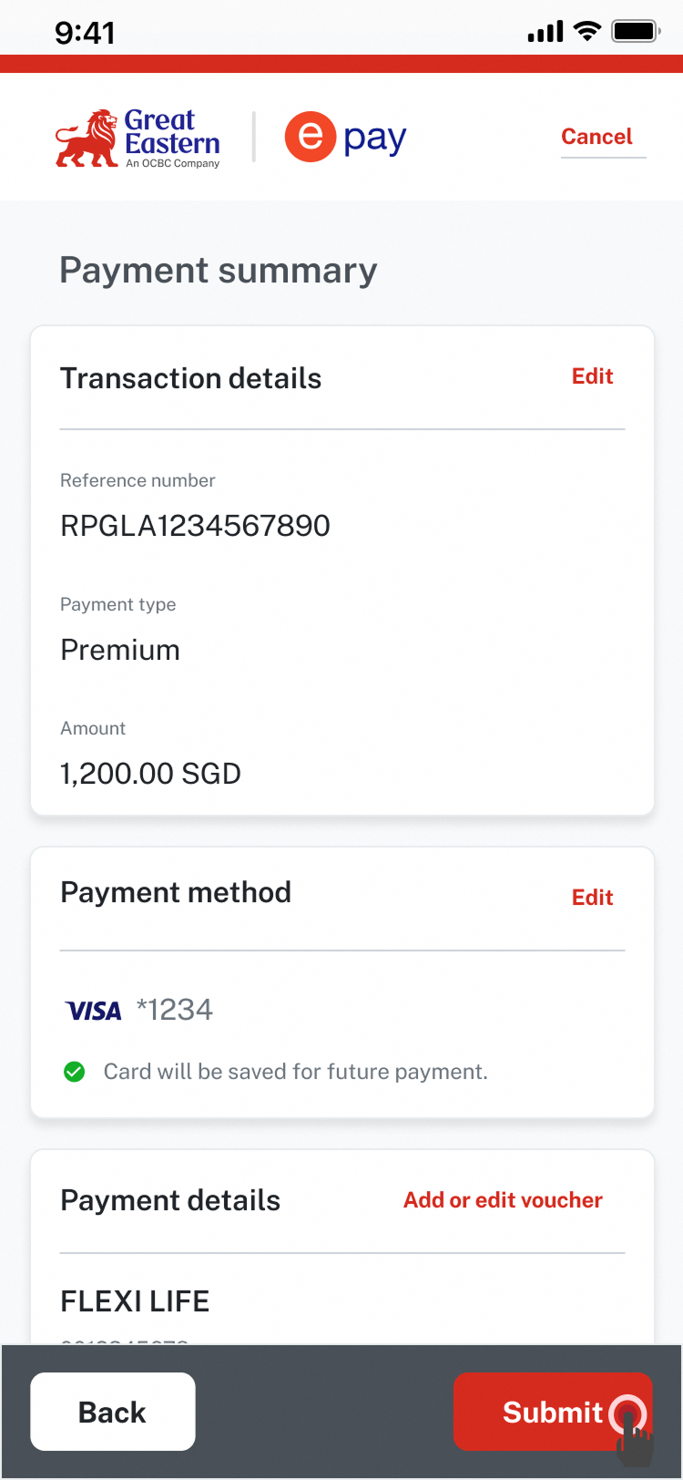 - UOB or SCB account holder: Select Great Eastern Life - Accident & Health policies as the billing organisation.