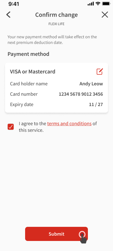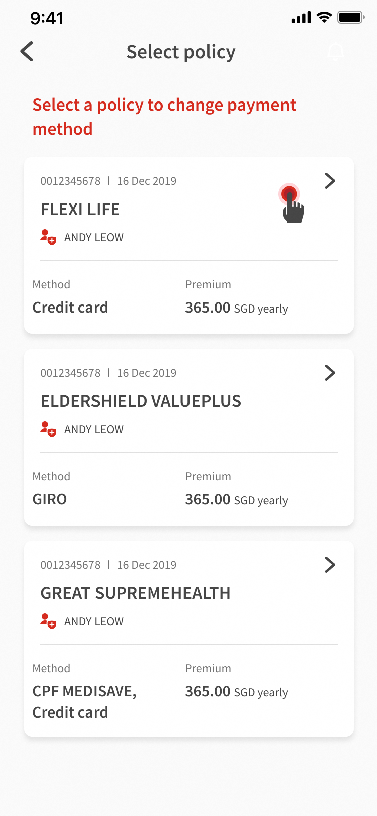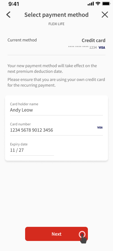 - Credit card payment is available for all Accident and Health policies and new Singapore Dollar regular premium life policies submitted from 15 October 2020 onwards.