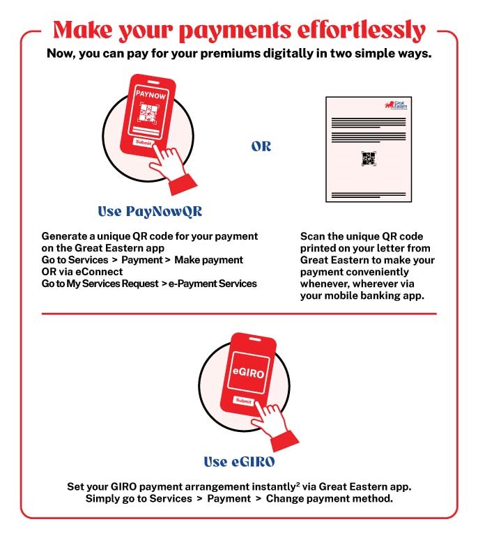 Alternatively, enroll for scheduled payments such as eGIRO for added peace of mind. We will deduct the premium automatically for renewals.