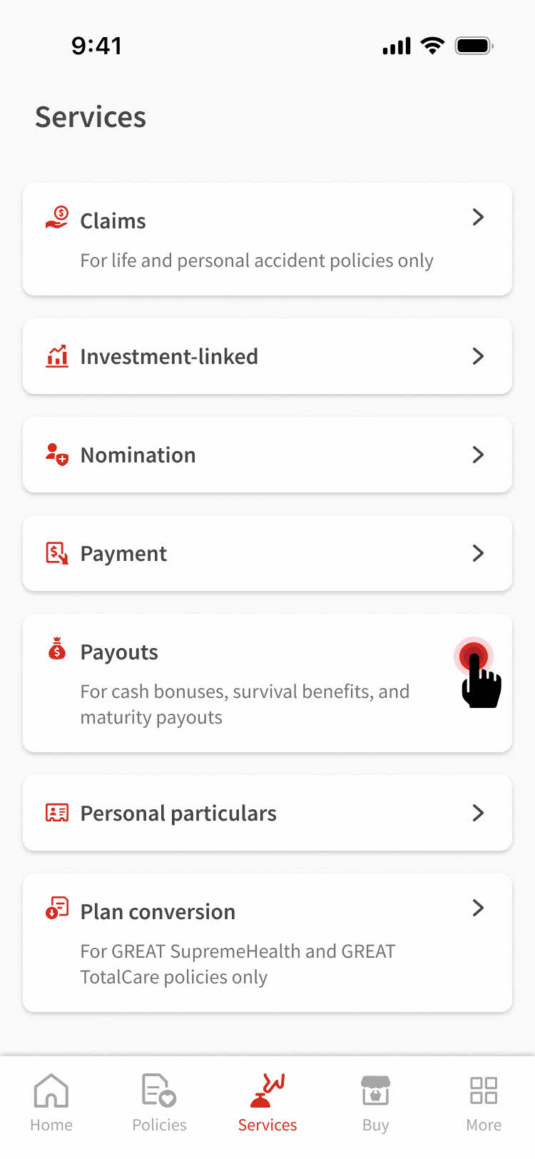 The policies that are eligible for payout method change will be shown on your Great Eastern App.