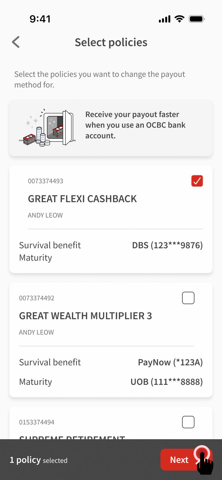 Step 4: Select the policy you want to change payout method for, then tap Next.