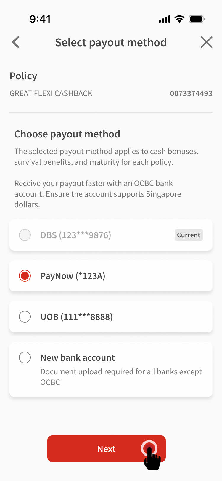 Use PayNow to receive your payout quickly and easily. If you don’t have PayNow, sign up at a participating bank or credit your payout to an OCBC Bank account for faster payout.