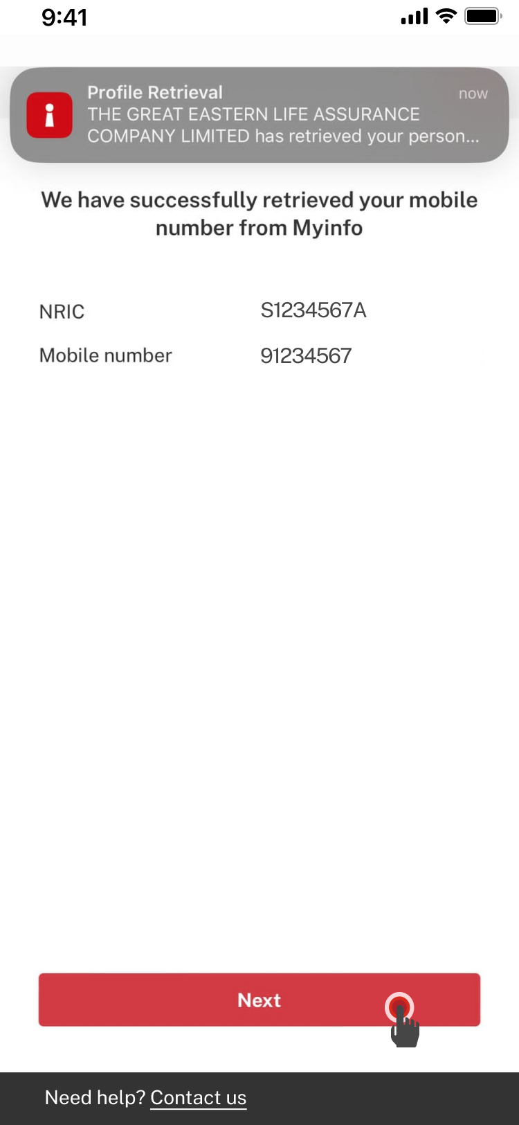 Ensure that your personal particulars in the on-screen alert are accurate. If not, update your personal particulars in Myinfo and re-do the profile retrieval. Tap Next.