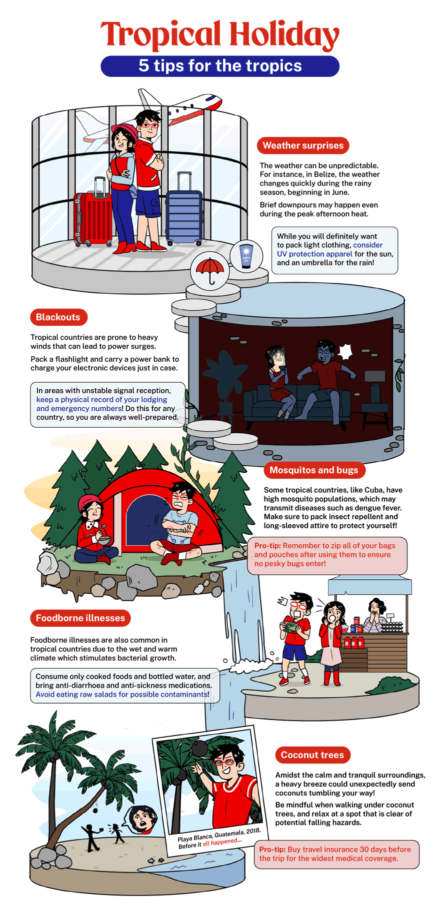 Navigating the tropics is quite an adventure: unpredictable weather conditions, mosquitoes, and possible food dangers. But don’t shy away from a wonderful tropical holiday! Just prepare well, avoid eating raw foods (especially salads), secure your travel insurance and you’re all set to jet!