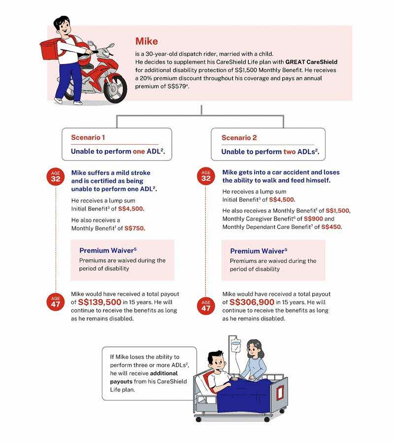 Upon his inability to perform 3 ADLs, Mike receives payouts from GREAT CareShield in addition to his CareShield Life payouts.
