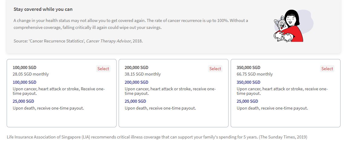 Right now, most plans allow you to choose from as little as S$50k. LIA recommends for critical illness protection of ~4 times of one’s annual income3, but of course, some patients may be able to recover faster and resume work earlier. Ultimately, how long it takes will also depend on your physical health, how well your body responds to the drugs and treatments, as well as the severity of your medical condition.
