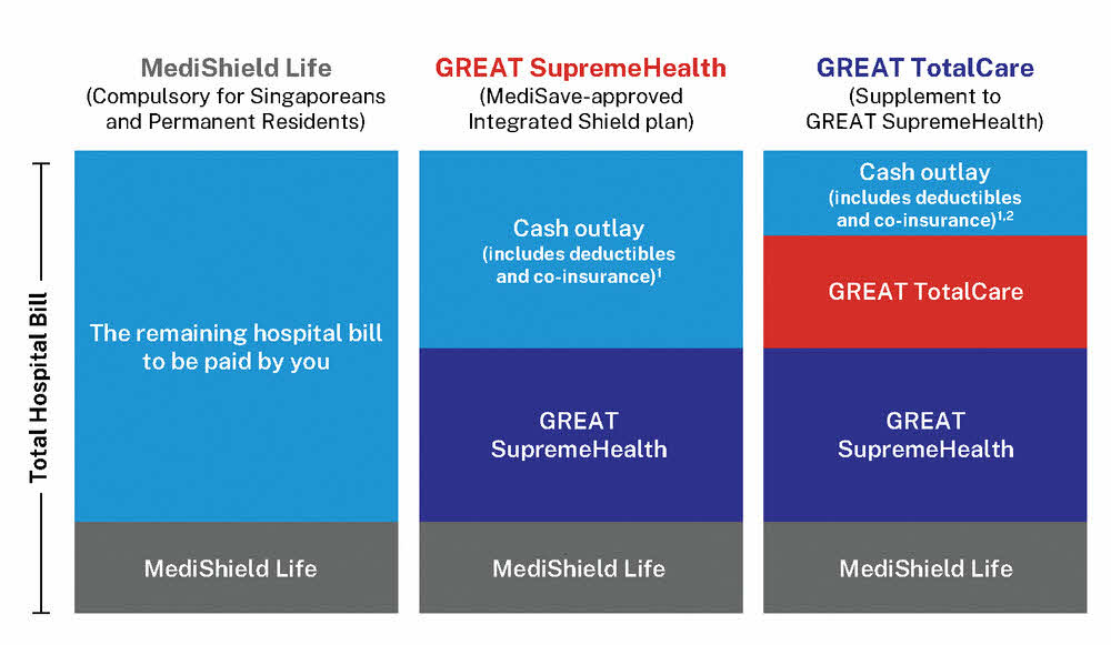 GREAT TotalCare is not a MediSave-approved Integrated Shield plan and premiums are not payable using MediSave. GREAT TotalCare is designed to complement the benefits offered under GREAT SupremeHealth. As these products have no savings or investment feature, there is no cash value if the policy ends or is terminated prematurely.
