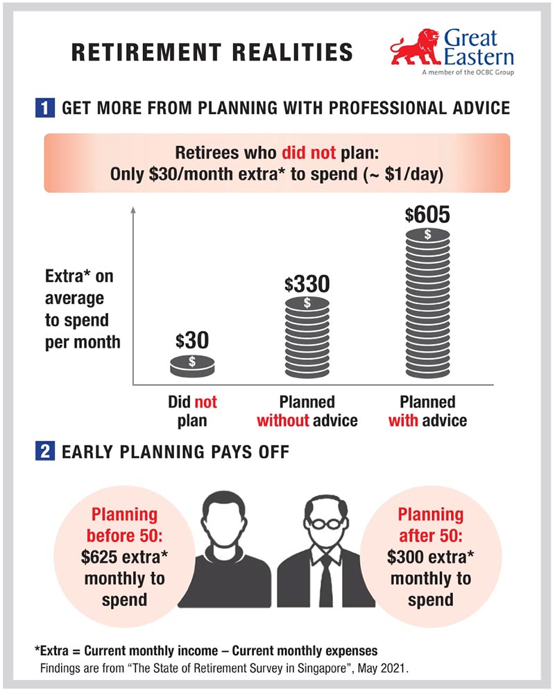 Going back to Great Eastern’s state of retirement in Singapore survey, the difference between those who planned for their retirement with and without professional help is quite significant.