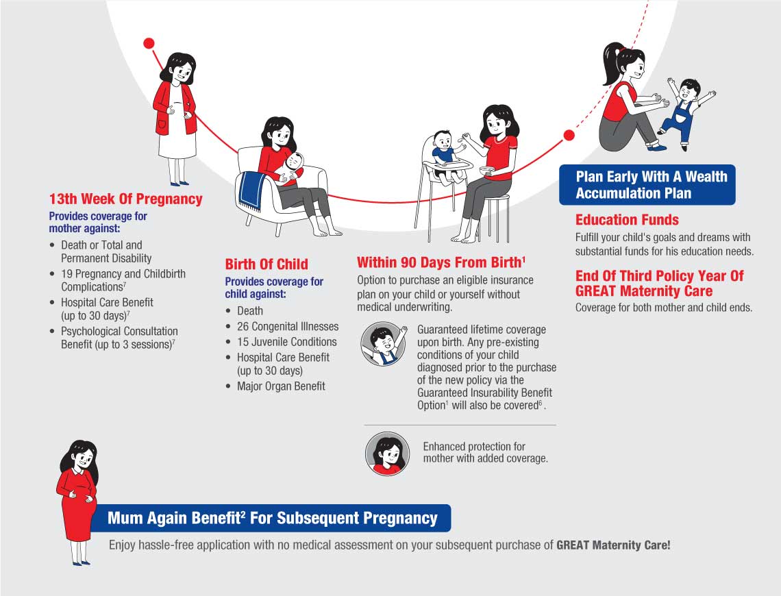 Do note that only policyholders of GREAT Maternity Care 2 that have been medically underwritten by us are eligible to utilise the Mum Again Benefit to purchase an eligible maternity plan that provides similar benefits.