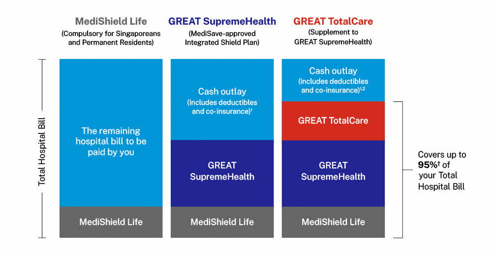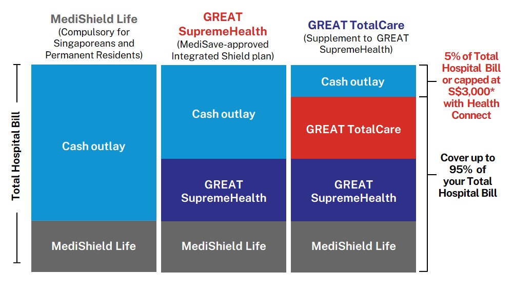 GREAT TotalCare is not MediSave-approved Integrated Shield plan and premiums are not payable using MediSave. GREAT TotalCare is designed to complement the benefits offered under GREAT SupremeHealth.
