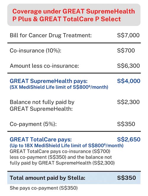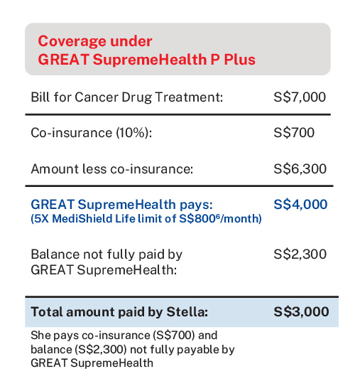 If Stella only has GREAT SupremeHealth P Plus plan, she will be entitled to 5X MediShield Life limit claim per month for cancer drug treatment. In this case, as drug treatment X has a MediShield Life limit of S$8006 per month, she is able to claim up to S$4,0006 per month for her cancer drug treatment (inclusive of MediShield Life Limit). She will have to pay cash out-of-pocket, for any remaining balance not claimable fully by her GREAT SupremeHealth plan.