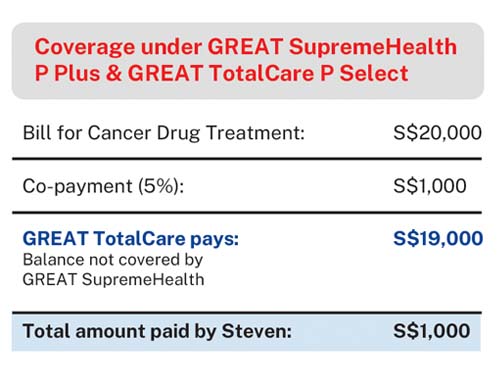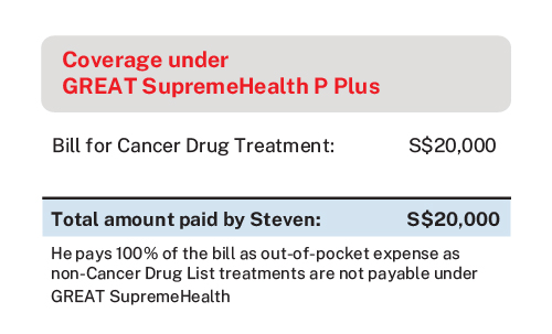 If Steven only has GREAT SupremeHealth P Plus plan, he will not be able to claim from his GREAT SupremeHealth P Plus plan and MediShield Life. He will have to pay cash out-of-pocket for his outpatient cancer drug treatment.