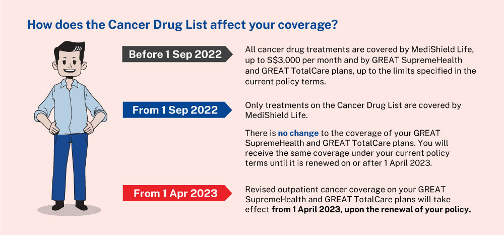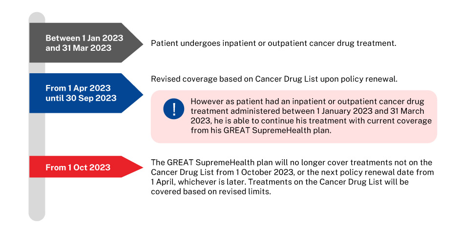 To allow sufficient time for affected patients to adjust to the new changes, if you undergo at least one inpatient or outpatient cancer drug treatment between 1 January 2023 and 31 March 2023, you will continue to receive current coverage until 30 September 2023 or your next policy renewal date from 1 April 2023, whichever is later.