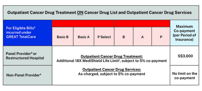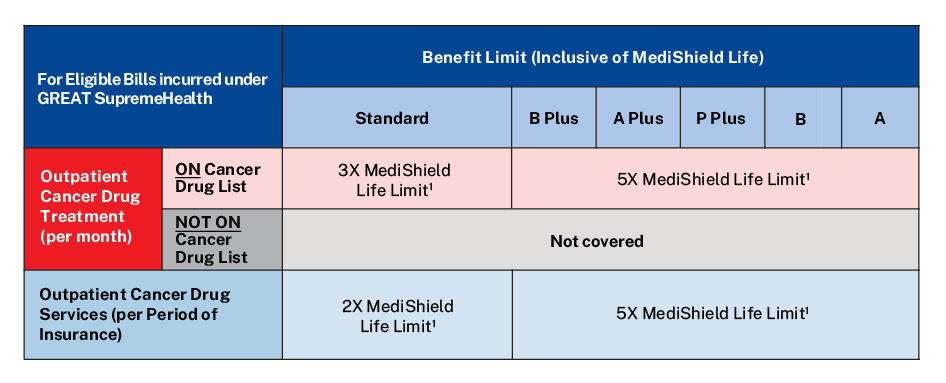 GREAT TotalCare – We will introduce a new Outpatient Cancer Treatment benefit to cover any remaining outpatient bill for cancer drug treatments on the Cancer Drug List as well as cancer drug services (i.e. the amount exceeding the claim limit under GREAT SupremeHealth). This new benefit will also cover selected outpatient cancer drug treatments that are not on the Cancer Drug List.