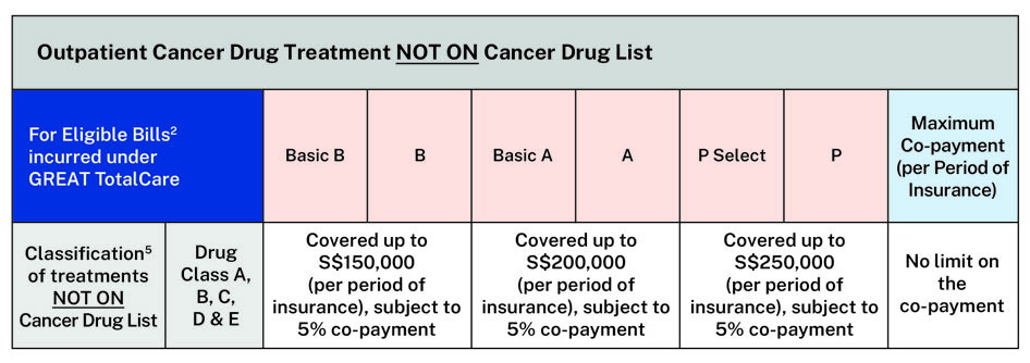 - Outpatient Cancer Drug Treatment benefit – Only cancer drug treatments on the Cancer Drug List will be claimable. Selected cancer drug treatments beyond the Cancer Drug List will be claimable under GREAT TotalCare. If you are currently undergoing cancer drug treatment, please consult your doctor early on whether your treatment is on the Cancer Drug List.
