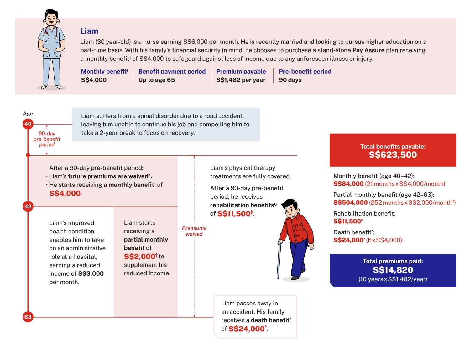 ‡ Liam receives a full reimbursement of his rehabilitation expenses of S$11,500, as Pay Assure reimburses rehabilitation expenses up to S$12,000 (three times the monthly benefit selected).