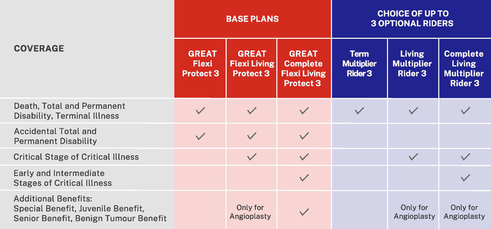 The table below shows an overview of coverage under GREAT Life Multiplier and the optional Critical Illness Multiplier Riders available: