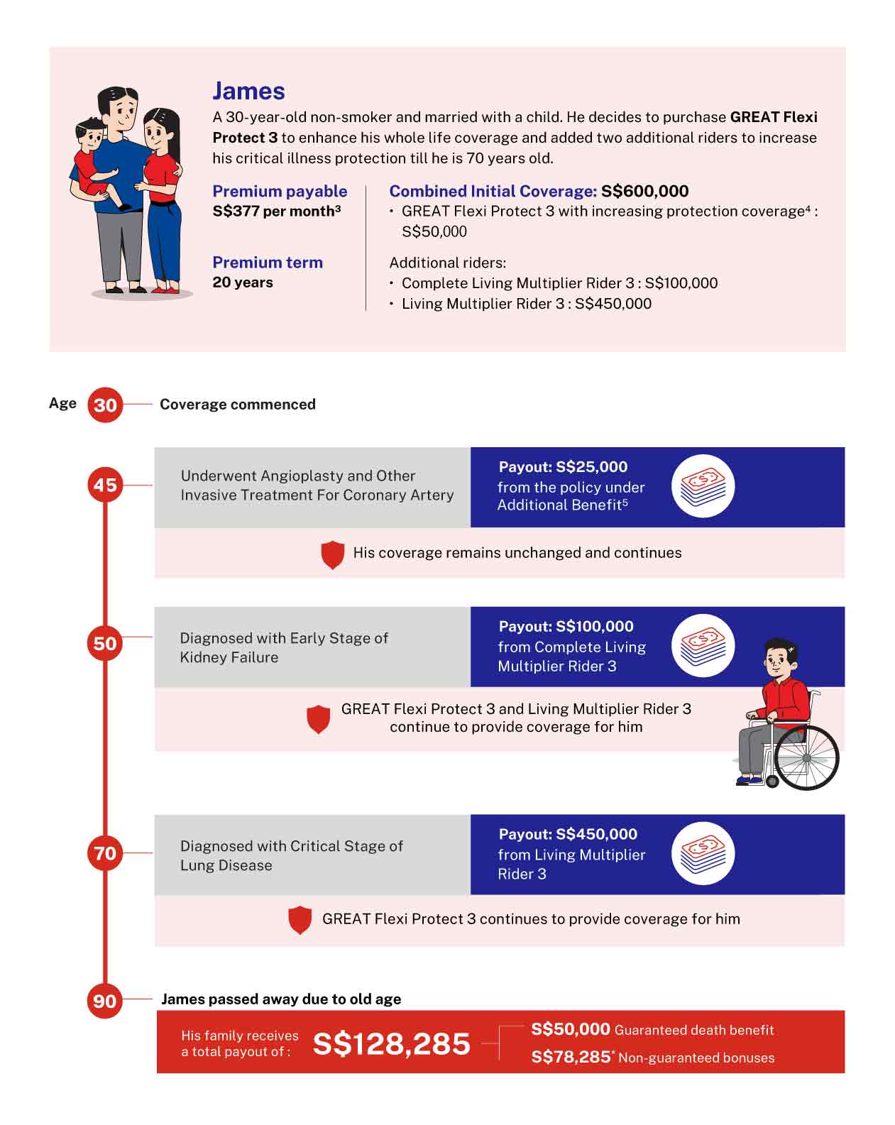 For more details on GREAT Life Multiplier, please refer to the product summary of the relevant plan and riders. Alternatively, you may also speak to your financial representative or call us at 1800 248 2888 (9am to 5.30pm (Mon- Fri).
