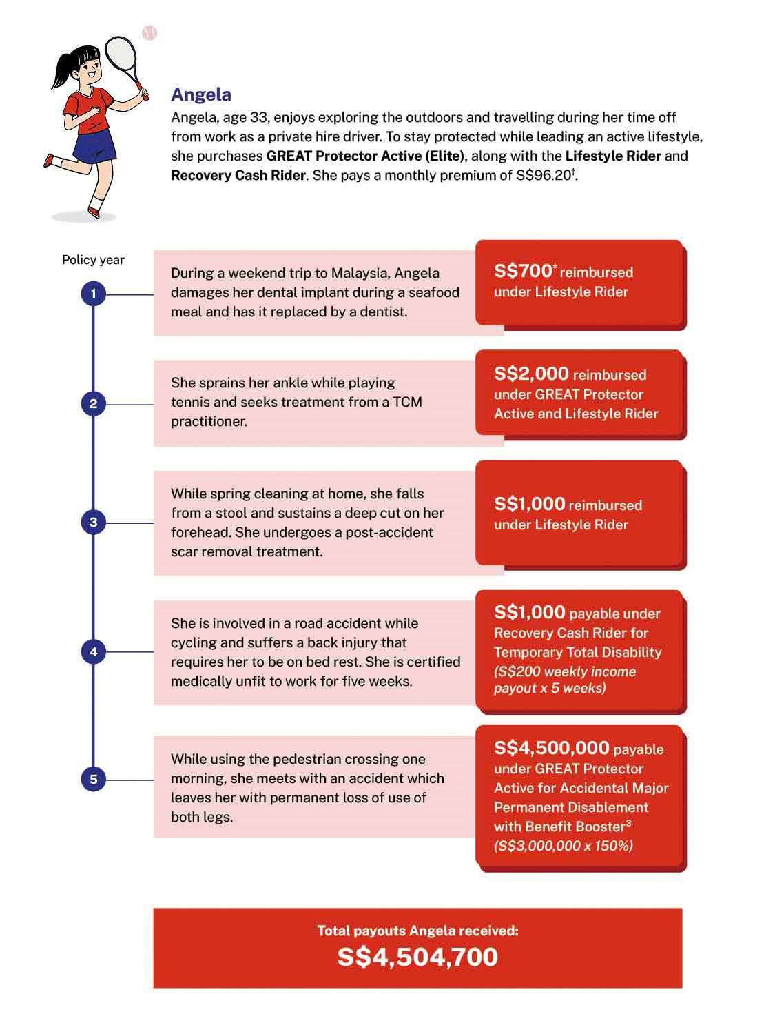 GREAT Protector Active is a yearly renewable personal accident plan which is specially designed to pay benefits in the event of an accident which results in Accidental Death, Accidental Major Permanent Disablement or Accidental Other Permanent Disablement. This plan also provides coverage for Accidental Medical Expenses Reimbursement and Benefit Booster in specified situations.