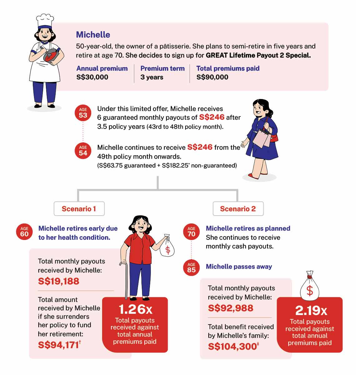 ‡ The total benefit received by Michelle’s family includes total guaranteed and non-guaranteed death benefit plus remaining declared but unpaid cash bonus and non-guaranteed interest earned on unpaid monthly cash bonus. Based on an IIRR of 3.00% p.a., the total monthly payouts received by Michelle is S$62,577, the total benefit received by Michelle’s family is S$99,331, and the total illustrated benefits is S$163,978 (1.82x of total premiums paid).