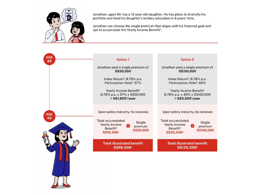 ^ The total accumulated Yearly Income Benefit at age 49 is S$9,559.