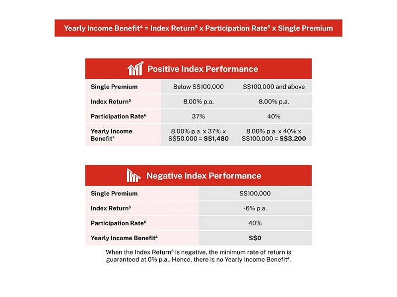 Positive index returns are uncapped and the minimum rate of return is guaranteed at 0% p.a. to protect your policy from poor market performance. The Participation Rate is determined at the start of the segment. Should the rate of return is determined to be at the minimum of 0%p.a., no Yearly Income Benefit will be payable. The rate of return is calculated based on the Index Return and the Participation Rate for the segment.