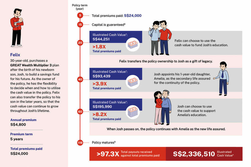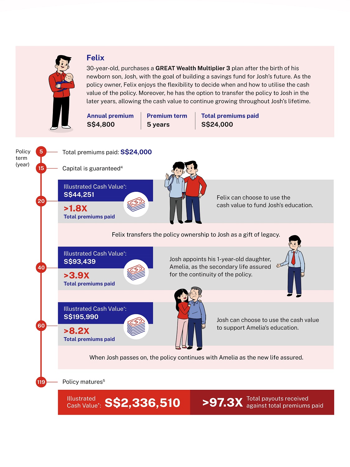 1 Based on the illustrated cash value at the end of policy year 60, premium payment term of 5 years and an Illustrated Investment Rate of Return (IIRR) of the participating fund at 4.25% p.a.. Based on an IIRR at 3.00% p.a., the multiplied returns are up to 4.4X or more. Potential returns are not guaranteed and are dependent on the premium payment term and policy year when the plan terminates. The actual benefits payable may vary according to the future performance of the participating fund.