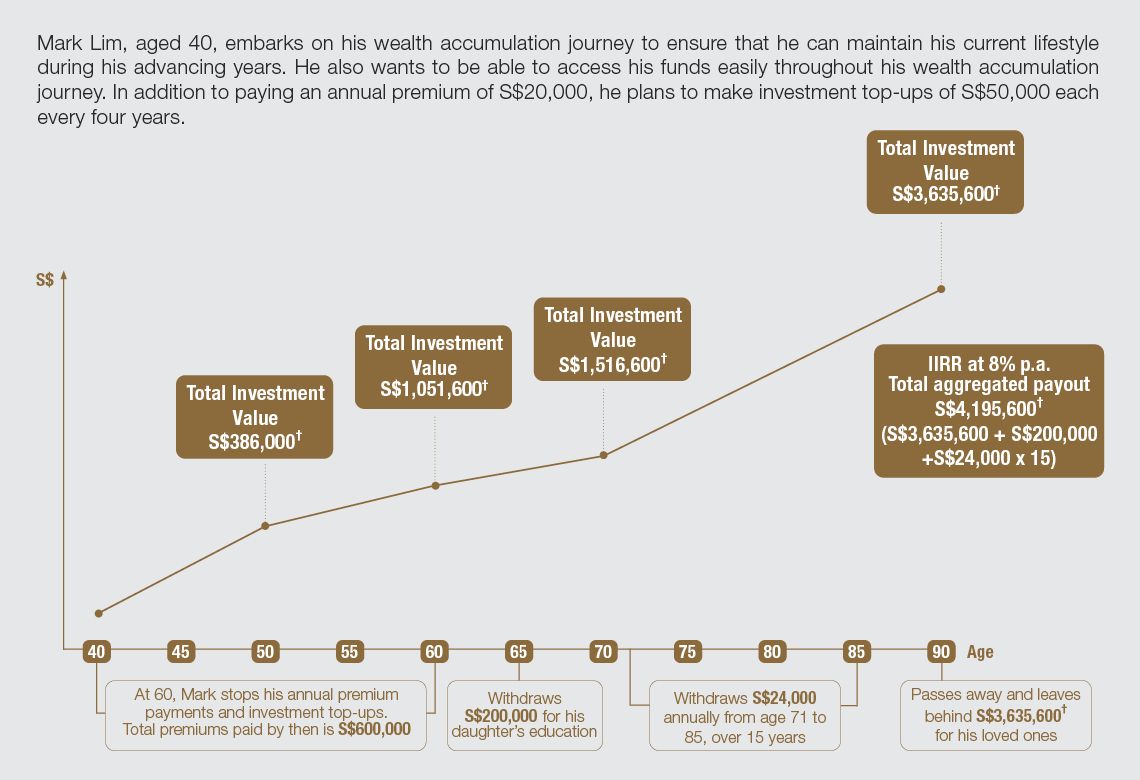 † Potential payout is illustrated based on 50% LionGlobal Singapore Balanced Fund and 50% JPMorgan Investment Funds – Global Income Fund, at IIRR of 8% p.a,.The actual payout payable will depend on the actual performance of the underlying assets of the funds. The performance of the funds is not guaranteed and the surrender value may be less than the total premiums paid.