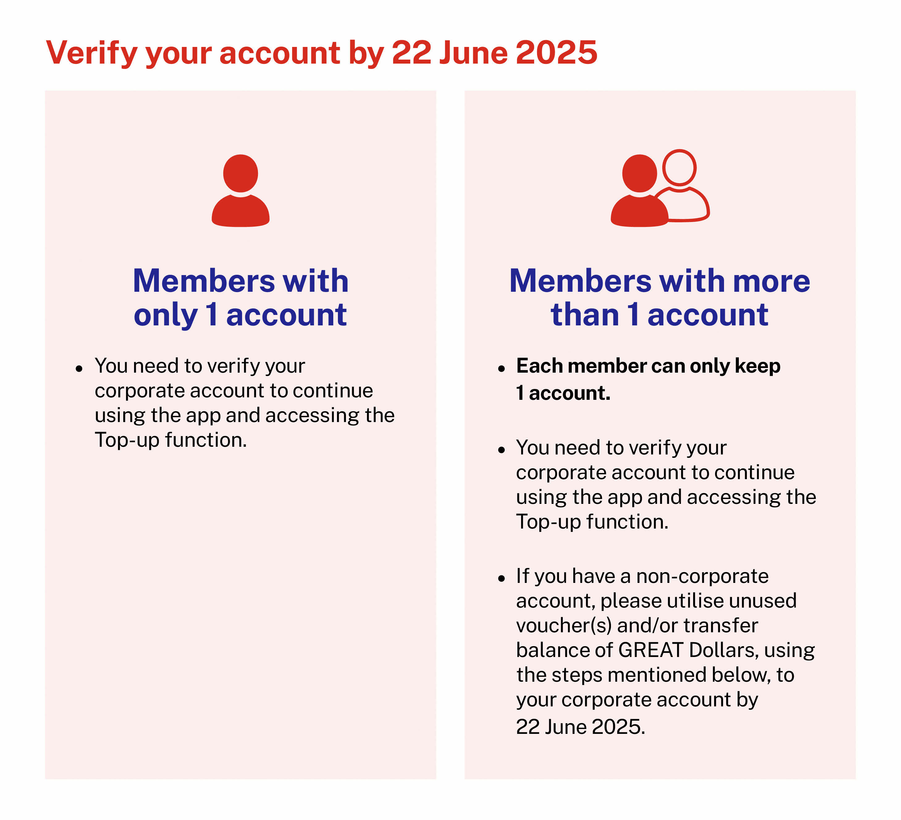 - Should you choose not to verify your corporate account, you will not have the access to the Top-up function and your corporate account will be deactivated after 30 June 2025.
