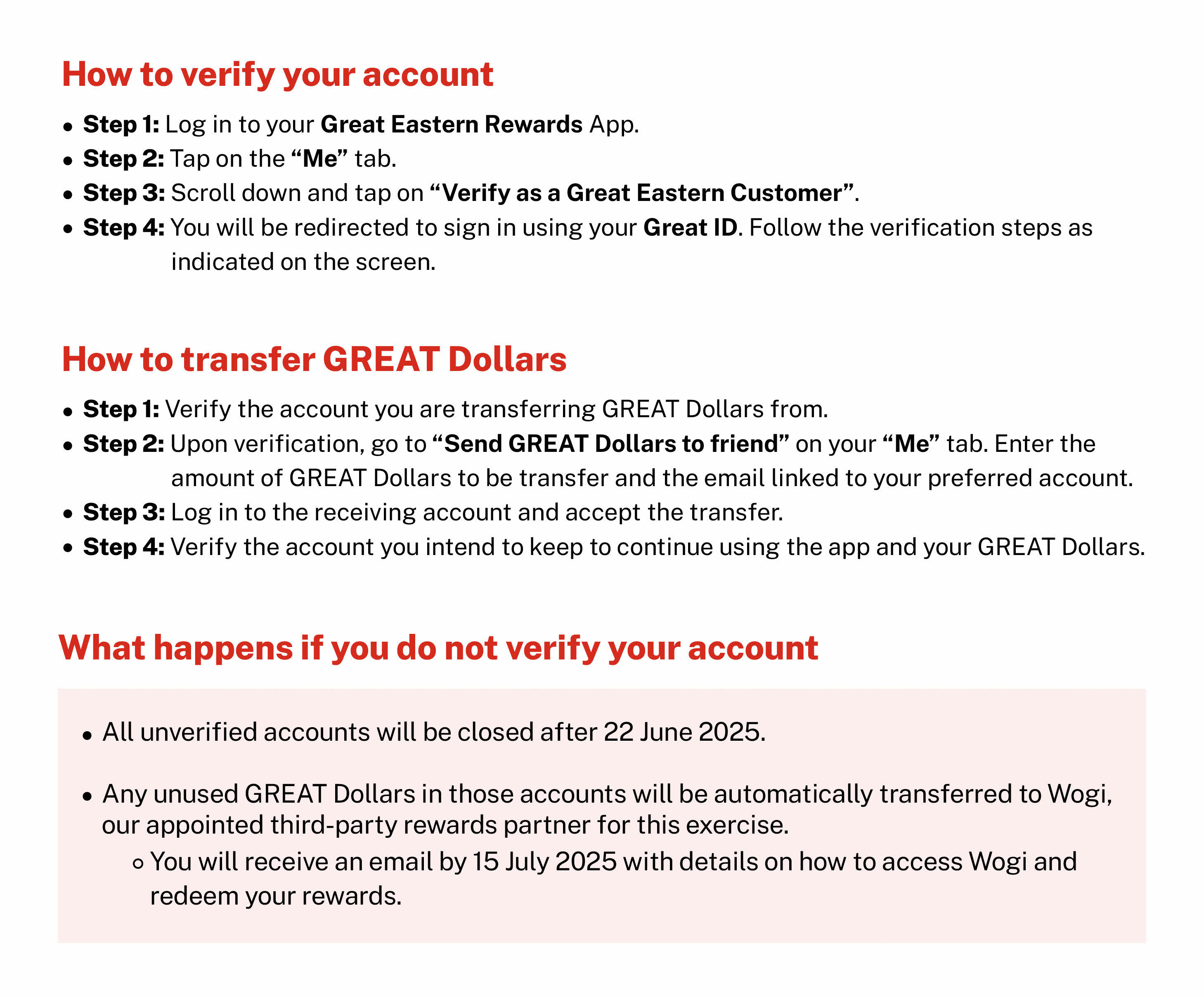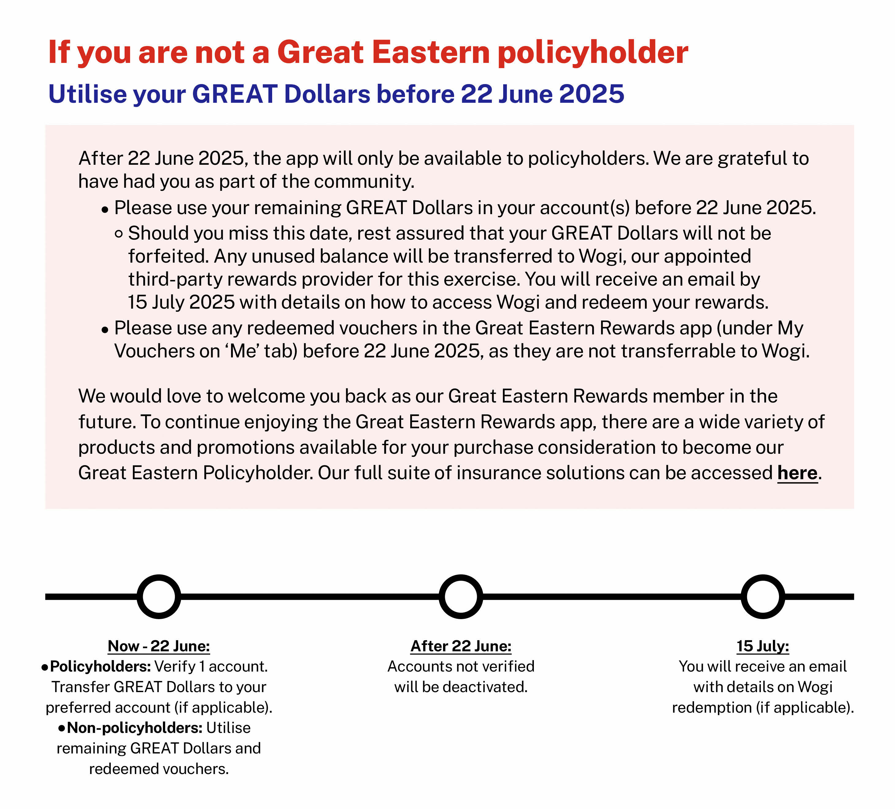 - You will be receiving an email with an activation code and steps to redeem the Wogi$ by 15 July 2025. This email will be sent to the email account linked to your Great Eastern Rewards App account with your GREAT Dollars balance. You may check your Wogi$ balance on the Wogi link provided.