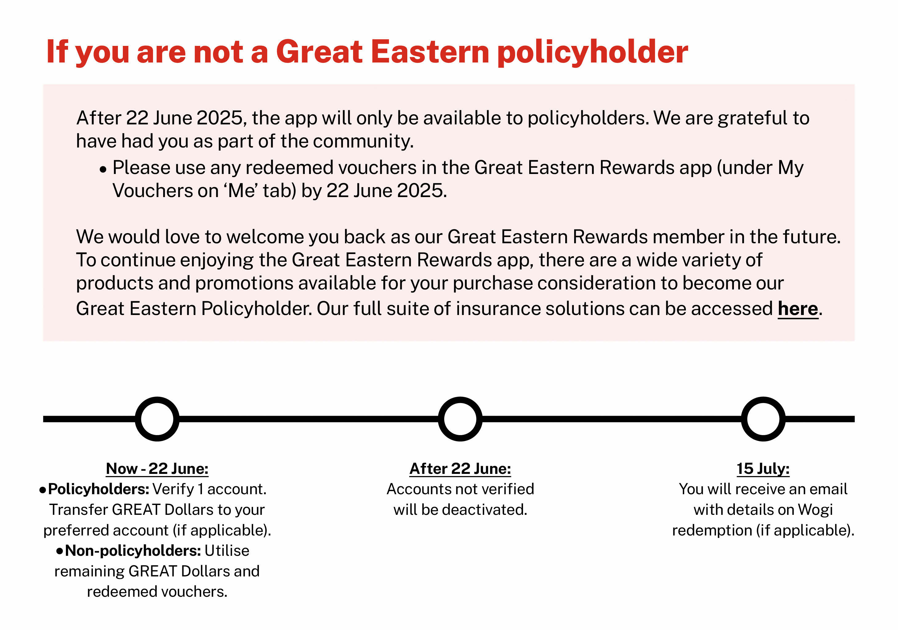 - Any balance of GREAT Dollars will be converted to a third-party rewards points platform and will no longer be available for consolidation or transfer in Great Eastern Rewards App after 22 June 2025.