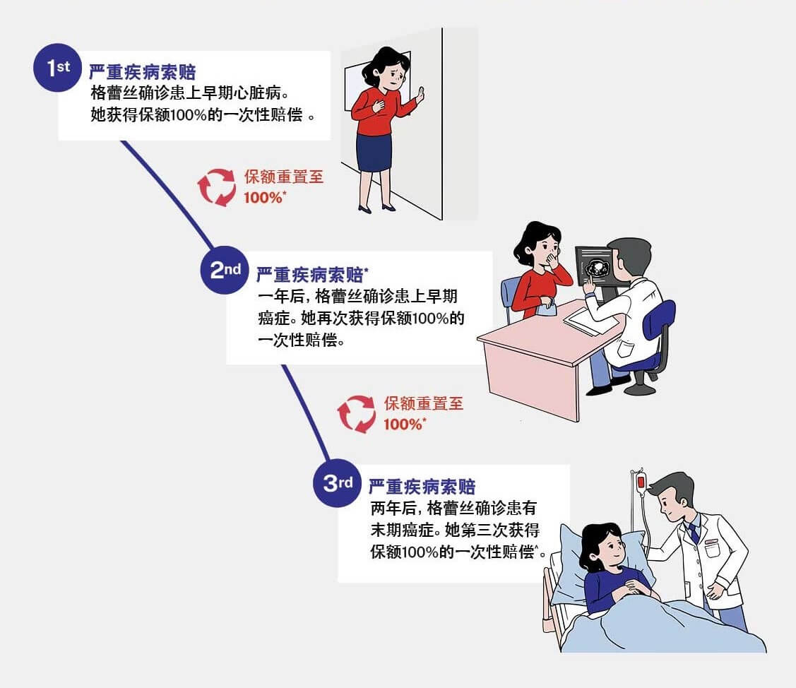 2 确诊严重疾病之日起的12个月后,及确诊后续的严重疾病时,保额将重置至100%。确诊紧接之前的严重疾病起的24个月后,保额将重置至100%。有关产品详细条款及细则,請參阅产品简介。