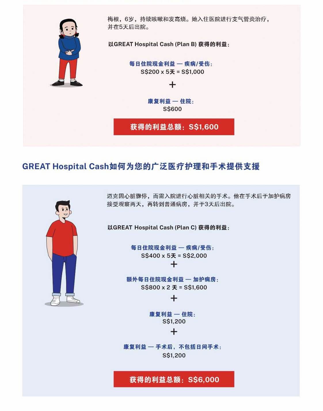 若在住院12个小时^或更长时,可领取每日高达S$600的赔偿。若入住加护病房,可获得每日高达S$1,200#的额外赔偿。此外,只要您住院至少3天,可获得高达S$1,800的额外单笔赔偿。若需要进行手术‡,还会另外获得高达S$1,800的赔偿。