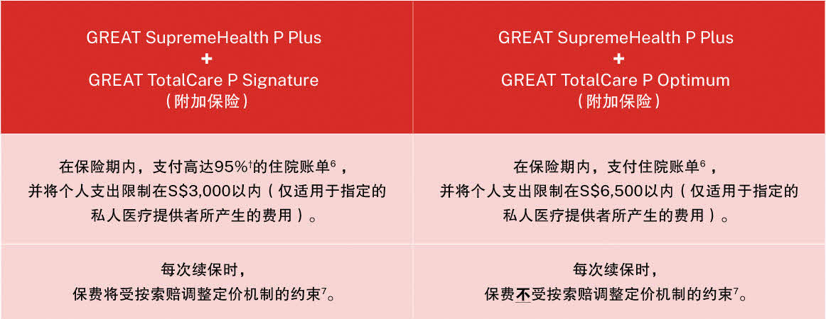 GREAT TotalCare旨在补充GREAT SupremeHealth提供的利益。GREAT TotalCare Plus为附加保险,并只能附加于GREAT TotalCare保单上,以便延申医疗保障至国外。