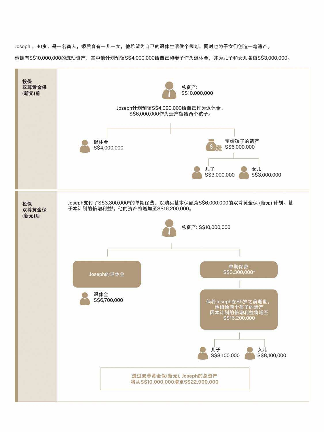 双尊黄金保 (新元) 及双尊黄金保 (美金) 各含一项分红终身人寿保险和一项不分红定期附加险,为死亡与绝症提供保障。请注意,若美元並非您的本土货币,您须承担外汇波动风险。