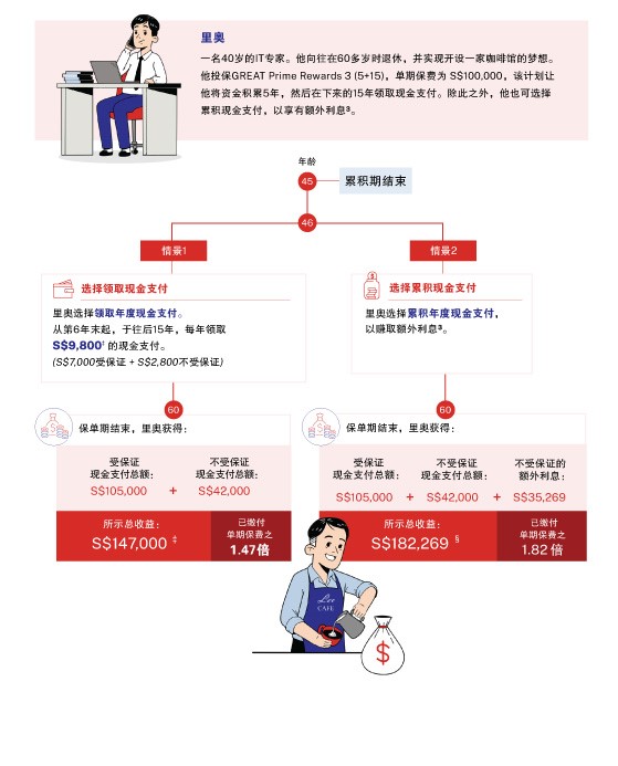 * 根据每年4.25%的说明投资回报率来计算。只适用于GREAT Prime Rewards 3 (5+15),单期保费S$100,000或以上,并选择支取现金选项。根据每年3.00%的说明投资回报率来计算,保单到期时的总现金支付在支取现金选项下为已缴单期保费多达1.27倍。实际支付的利益将视分红基金未来的表现而定。
