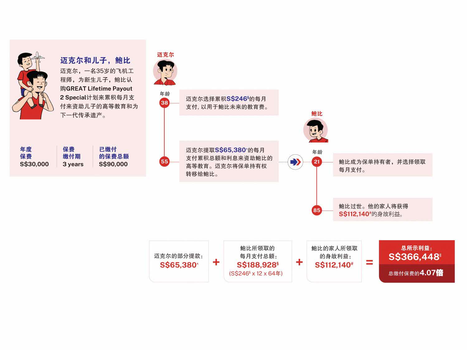 4 若GREAT Lifetime Payout Rider被退保,持保人须继续缴付到期的GREAT Lifetime Payout 2 Special未来保费,以避免保单失效。