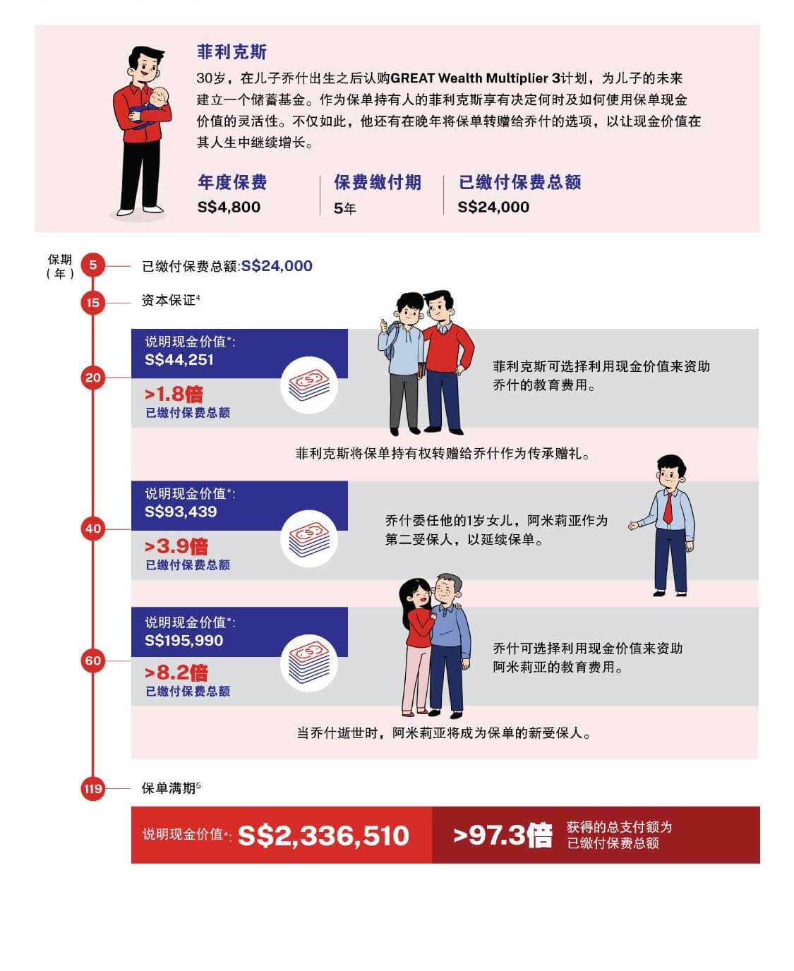 * 以上所示的数额包括受保证和不受保证利益。所示的不受保证利益是根据分红基金年率4.25%的说明投资回报率(IIRR)计算。按年率3.00%的说明投资回报率来计算,第20、40、60 和 119 保期年末的说明现金价值分别为S$34,433(已缴付保费总额的1.4倍)、S$58,213(已缴付保费总额的2.4倍)、S$106,423(已缴付保费总额的4.4倍)和S$716,746(已缴付保费总额的29.9倍)。实际支付的利益可能因分红基金将来的表现而改变。