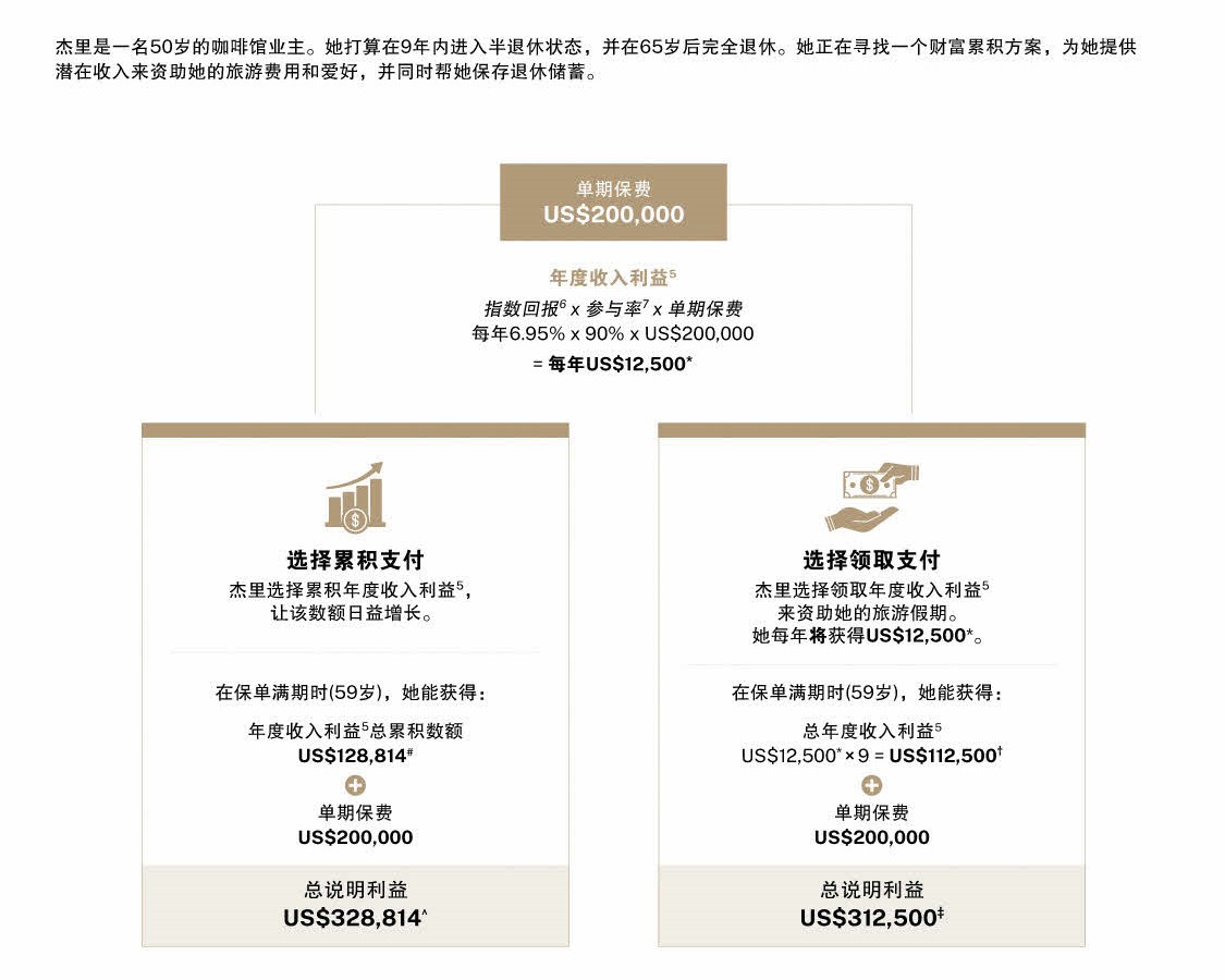 5 “年度收入利益”不受保证,并视相关指数和细分账户的参与率的表现而定。请注意,过去的表现可能不代表未来的表现。衍生品也将用于提供年度收入利益。