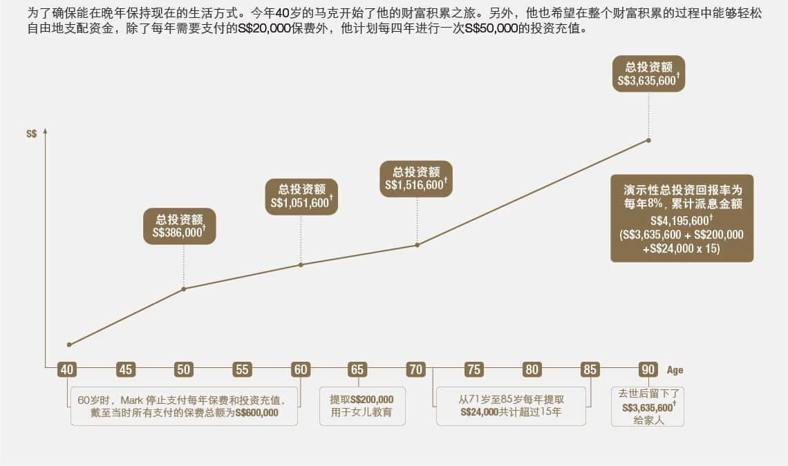 † 潜在派息金额是基于50%利安资金新加坡均衡基金和50%摩根大通投资基金——Global Income Fund,每年8%的投资回报率来计算, 实际派息金额取决于基金相关资产的实际表现。基金的表现不受保证,因此退保价值可能低于缴付保费的总额。根据每年4%的投资回报率来计算,50岁时的总投资金额为S$316,700,60岁时为S$686,600,70岁时为S$580,000,90岁时为S$347,900。总派息金额应为S$907,900(S$347,900 + S$200,000 + S$24,000 x 15)。所用的两个回报率(每年4%和每年8%)纯粹用于说明 并不代表投资表现最高与最低额度。